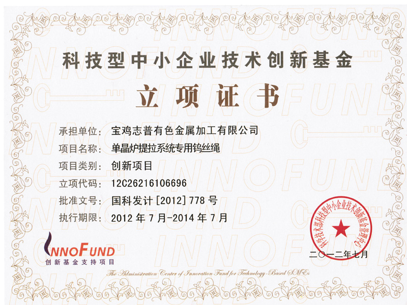 寶雞志普有色金屬加工有限公司單晶爐提拉系統(tǒng)專用鎢絲繩項(xiàng)目被確認(rèn)為科技型中小企業(yè)技術(shù)創(chuàng)新基金立項(xiàng)為創(chuàng)新項(xiàng)目。